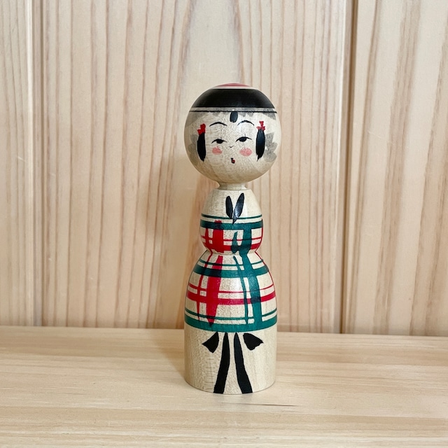 【池内潮音工人:弥治郎系】3寸 こけし くびれ 冬色チェック 赤・緑:9cm N10SI-609