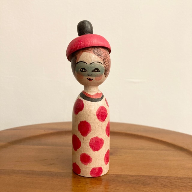【佐藤達雄工人:木地山系】こけし 赤帽子 カラフルドット:11.5cm N3TS-87