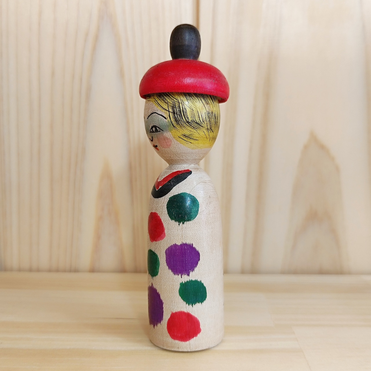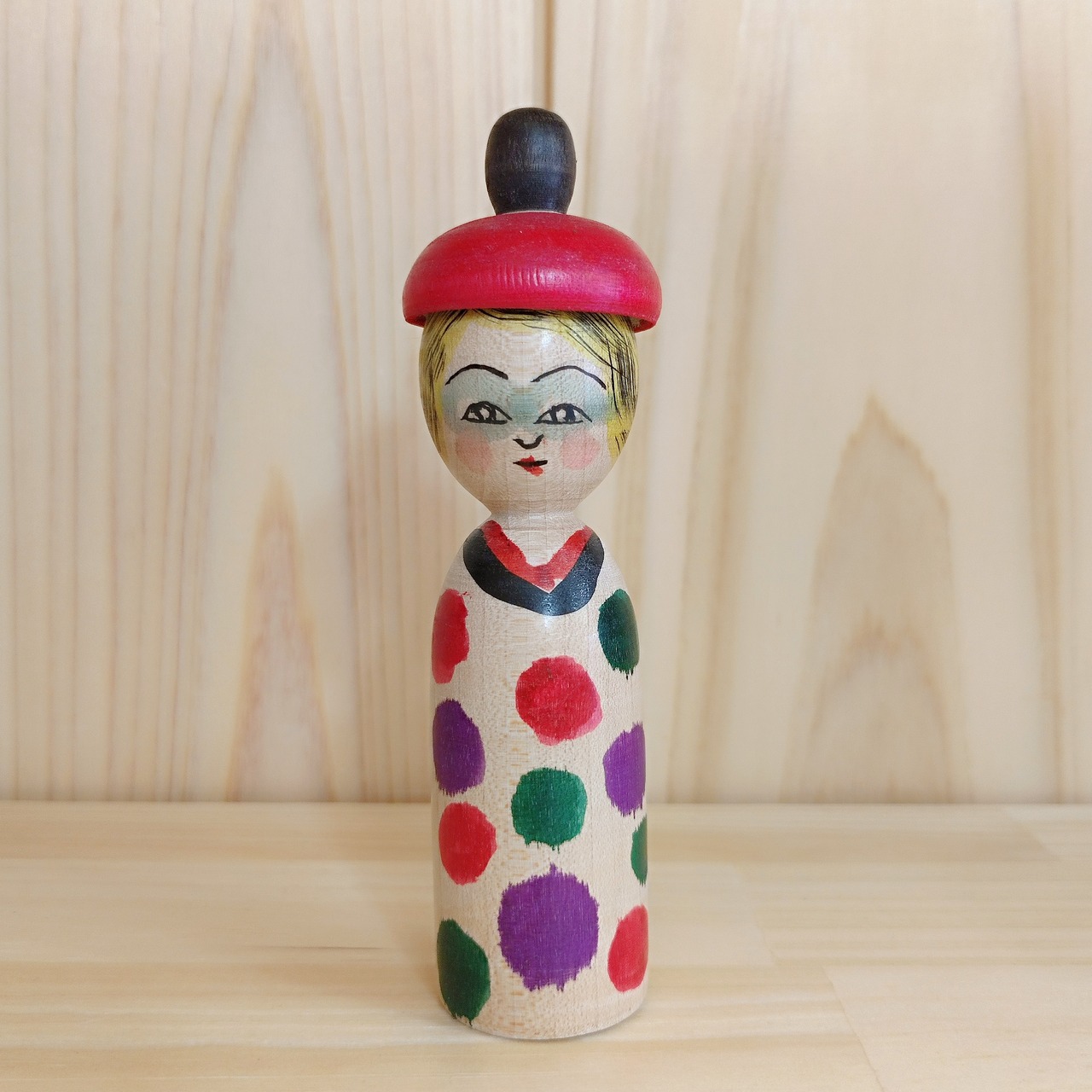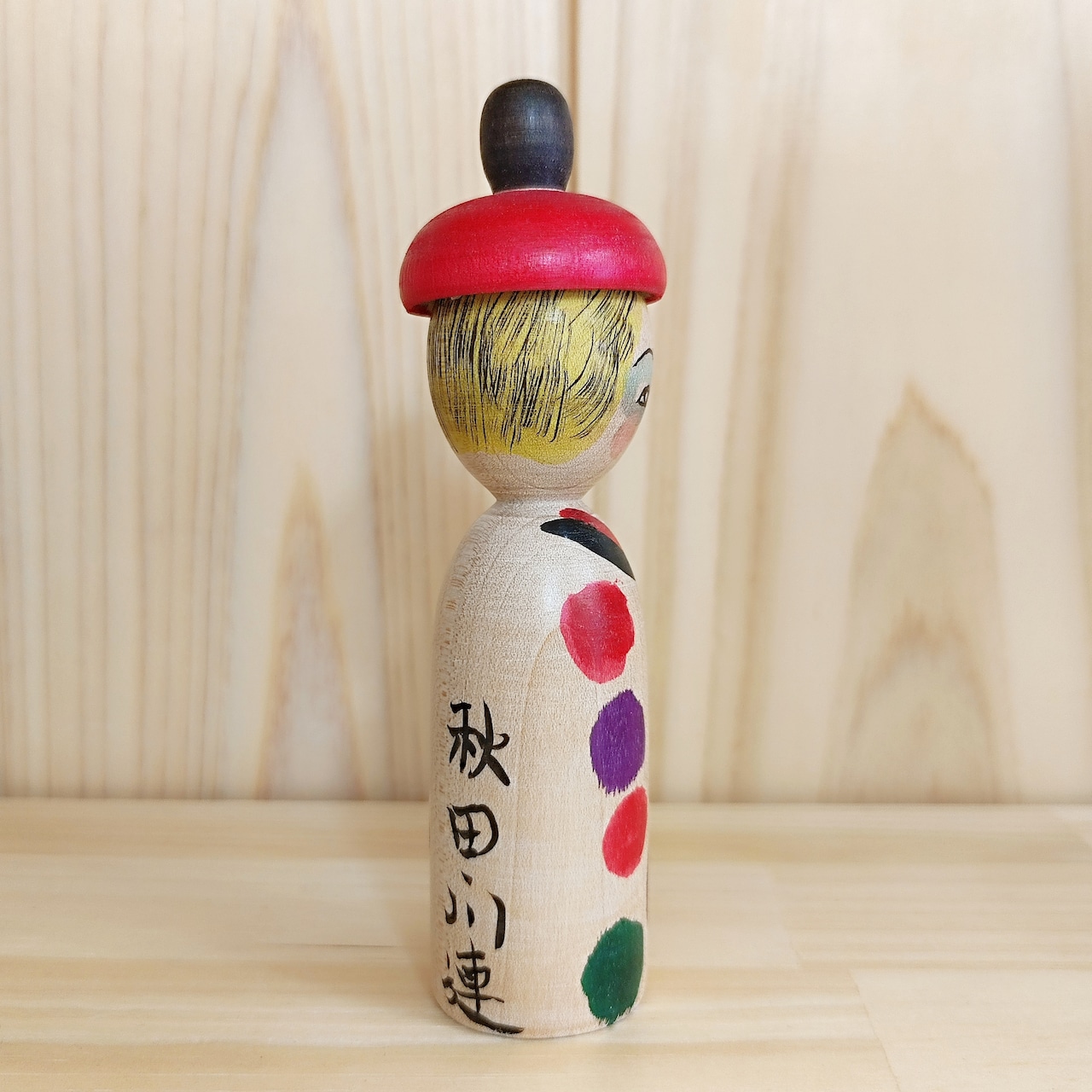 【佐藤達雄工人:木地山系】こけし 赤帽子 カラフルドット:11.5cm N3TS-89