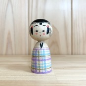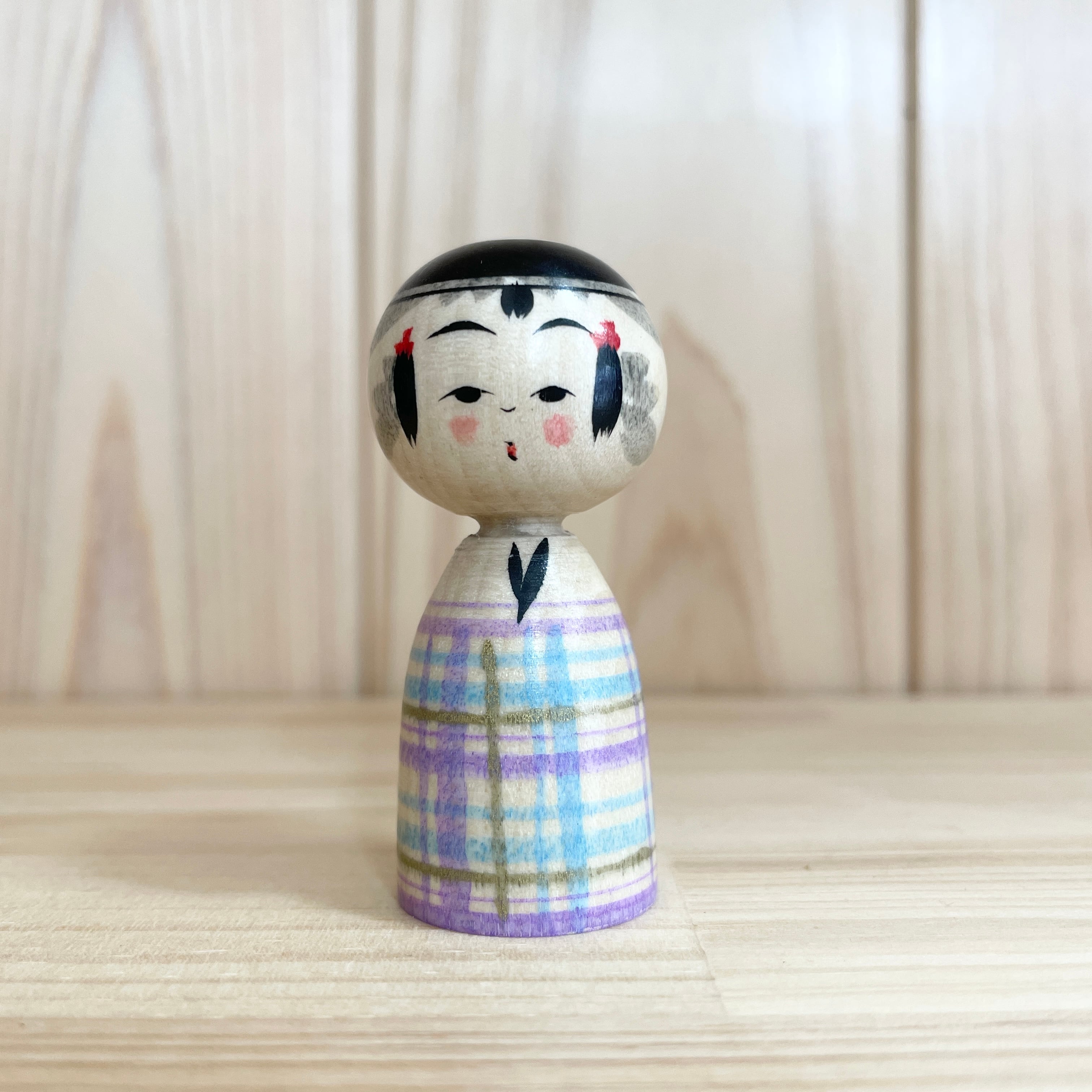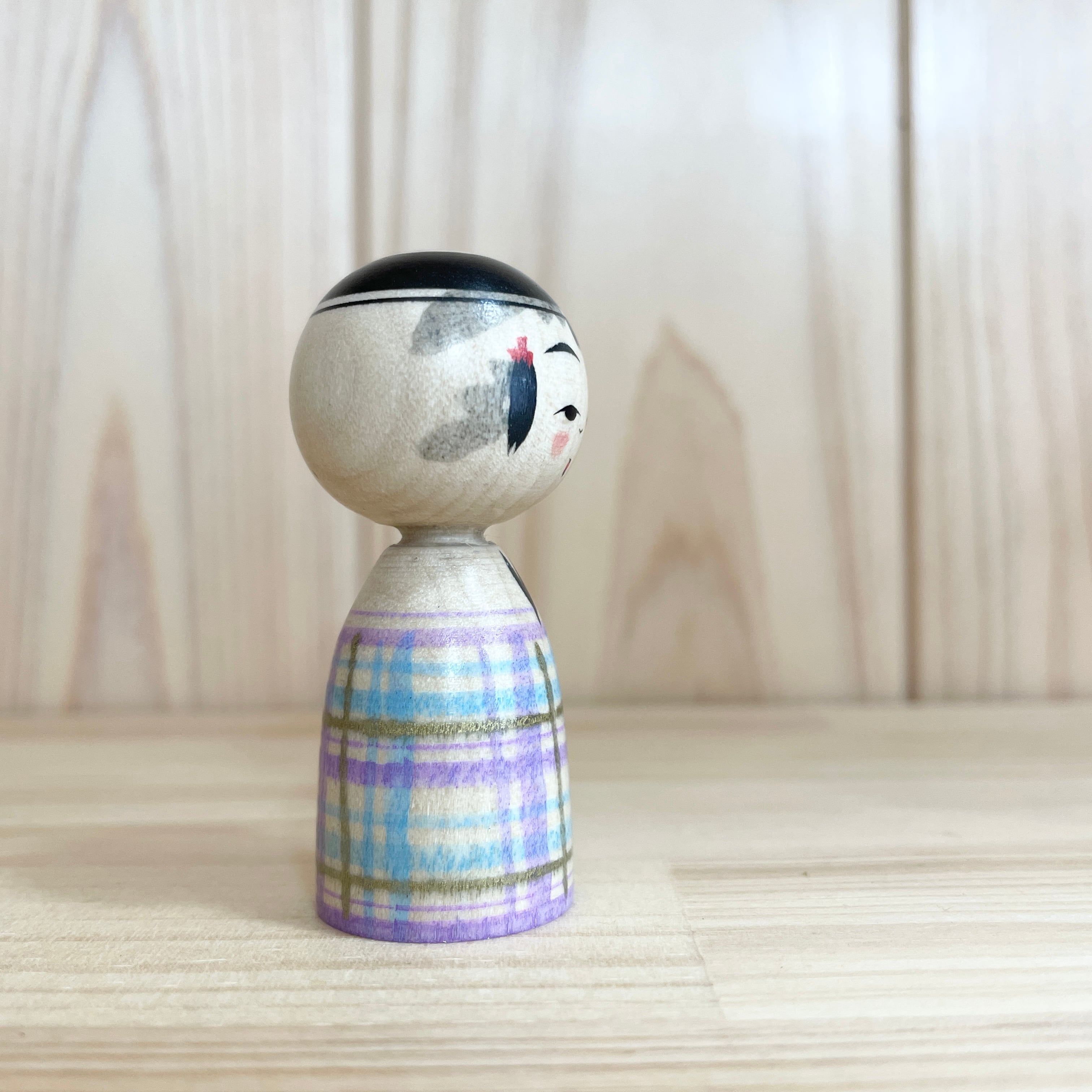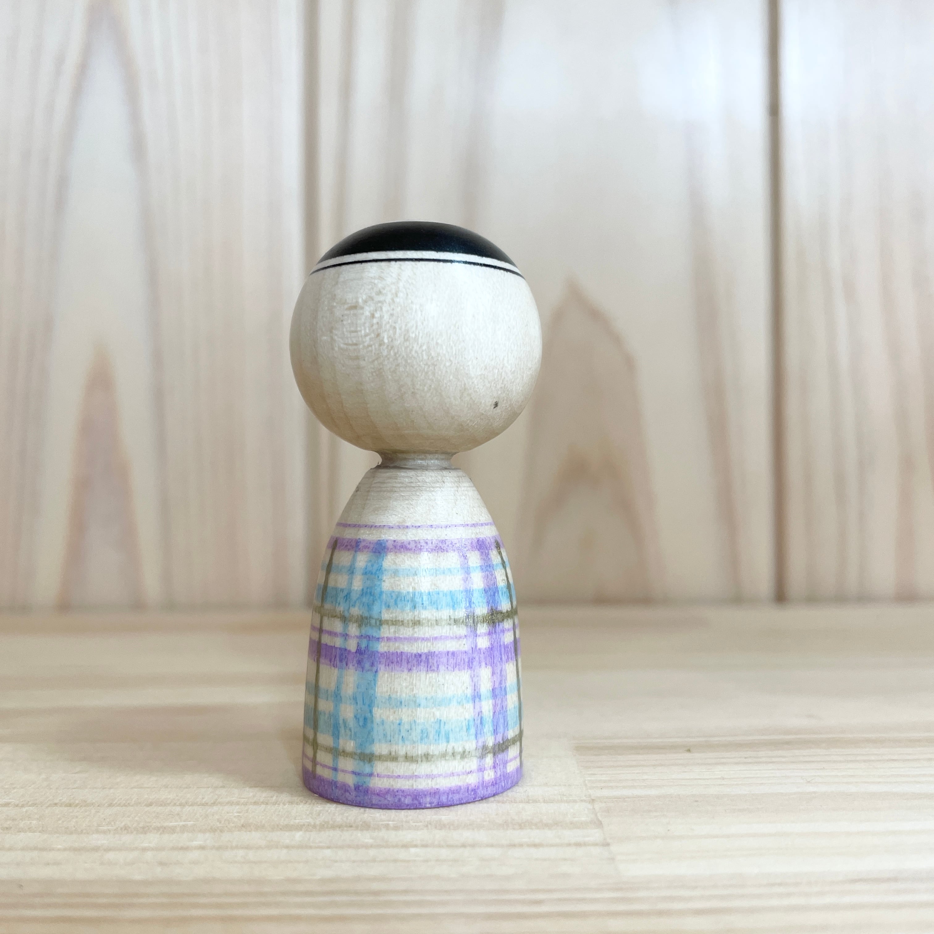 【池内潮音工人:弥治郎系】2寸 こけし チェック 薄紫 水色:6cm N10SI-298