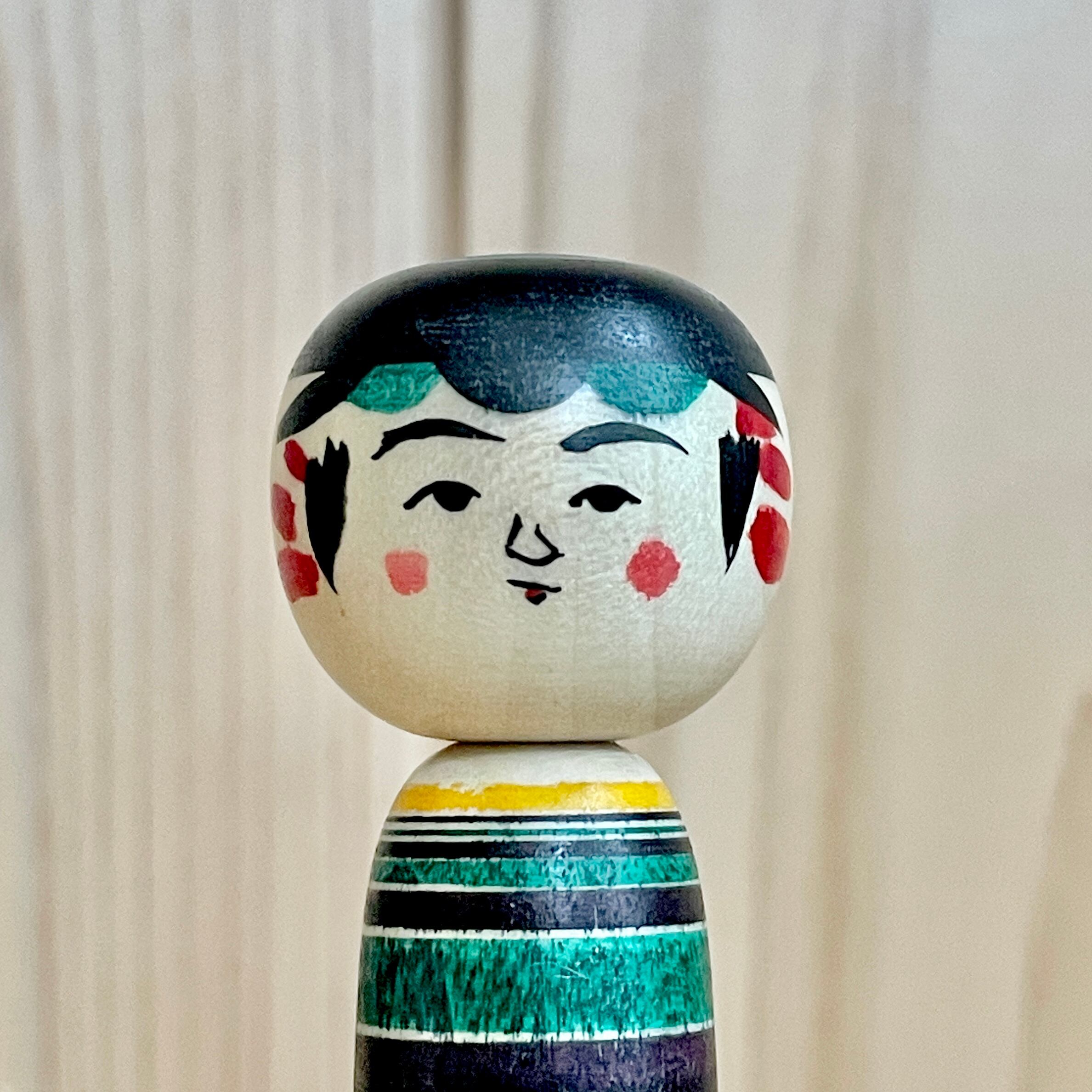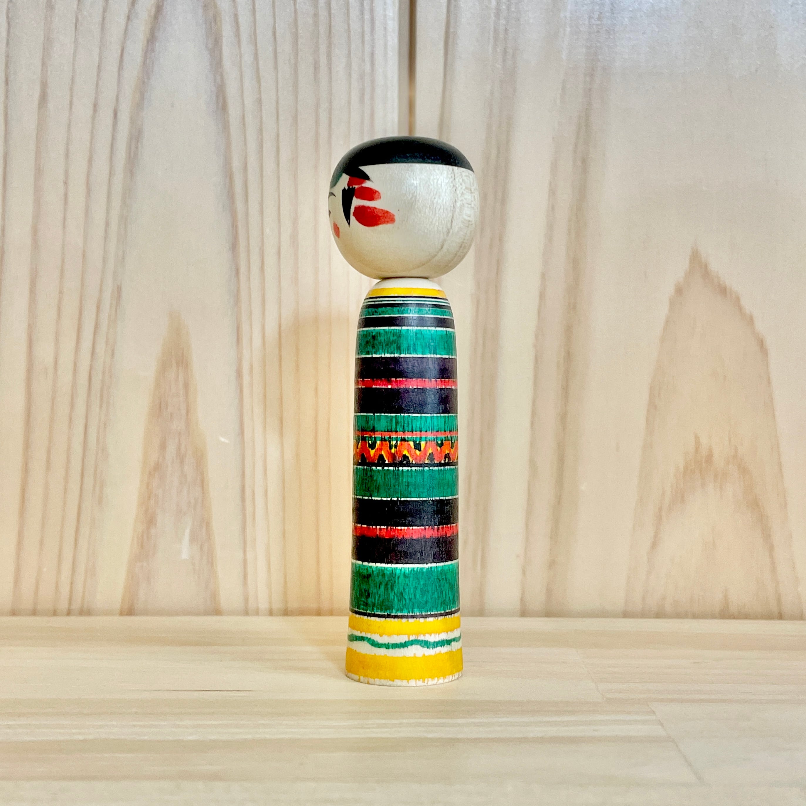 【佐藤誠孝工人:弥次郎系】3寸 こけし ろくろ線 緑赤 :9cm N10SS-81