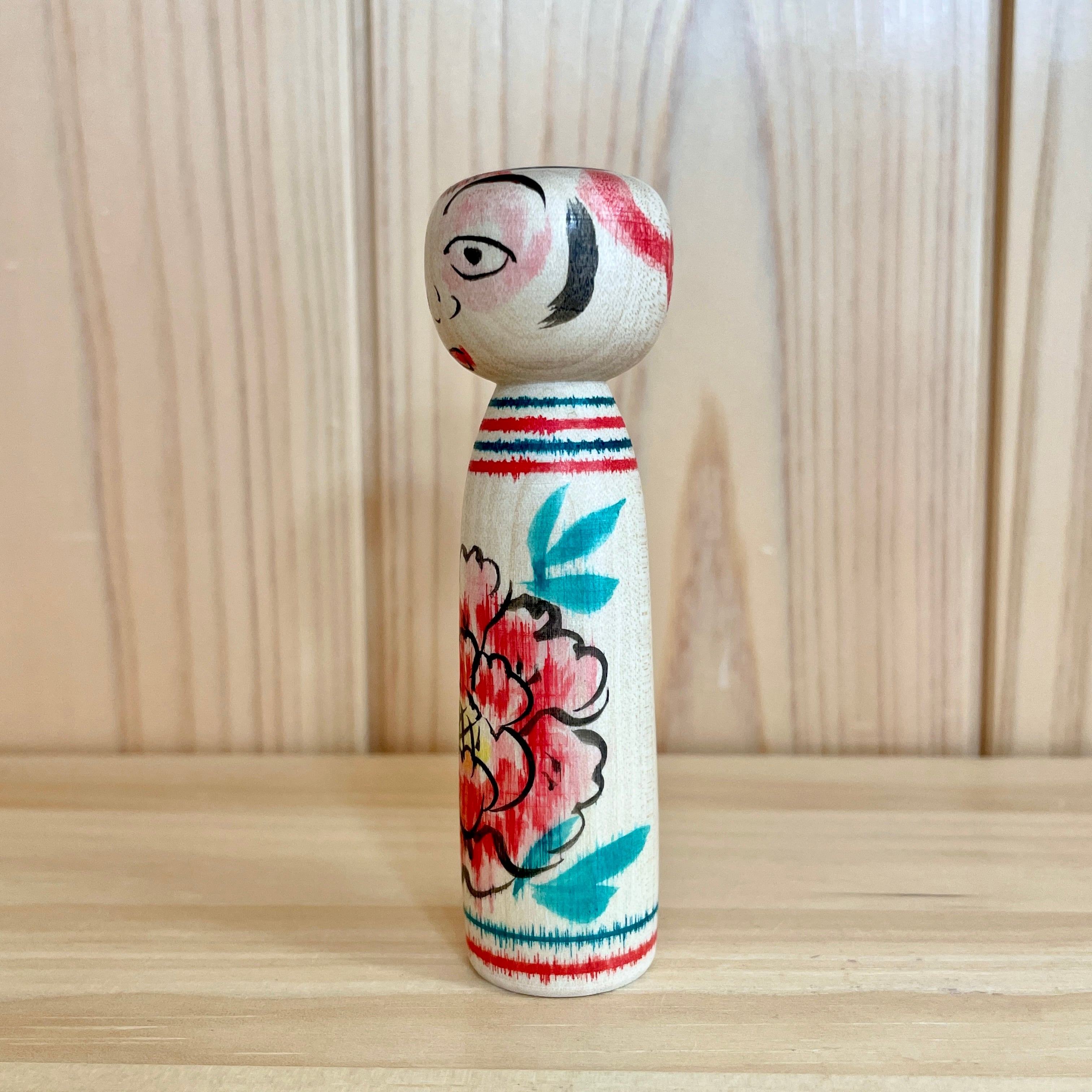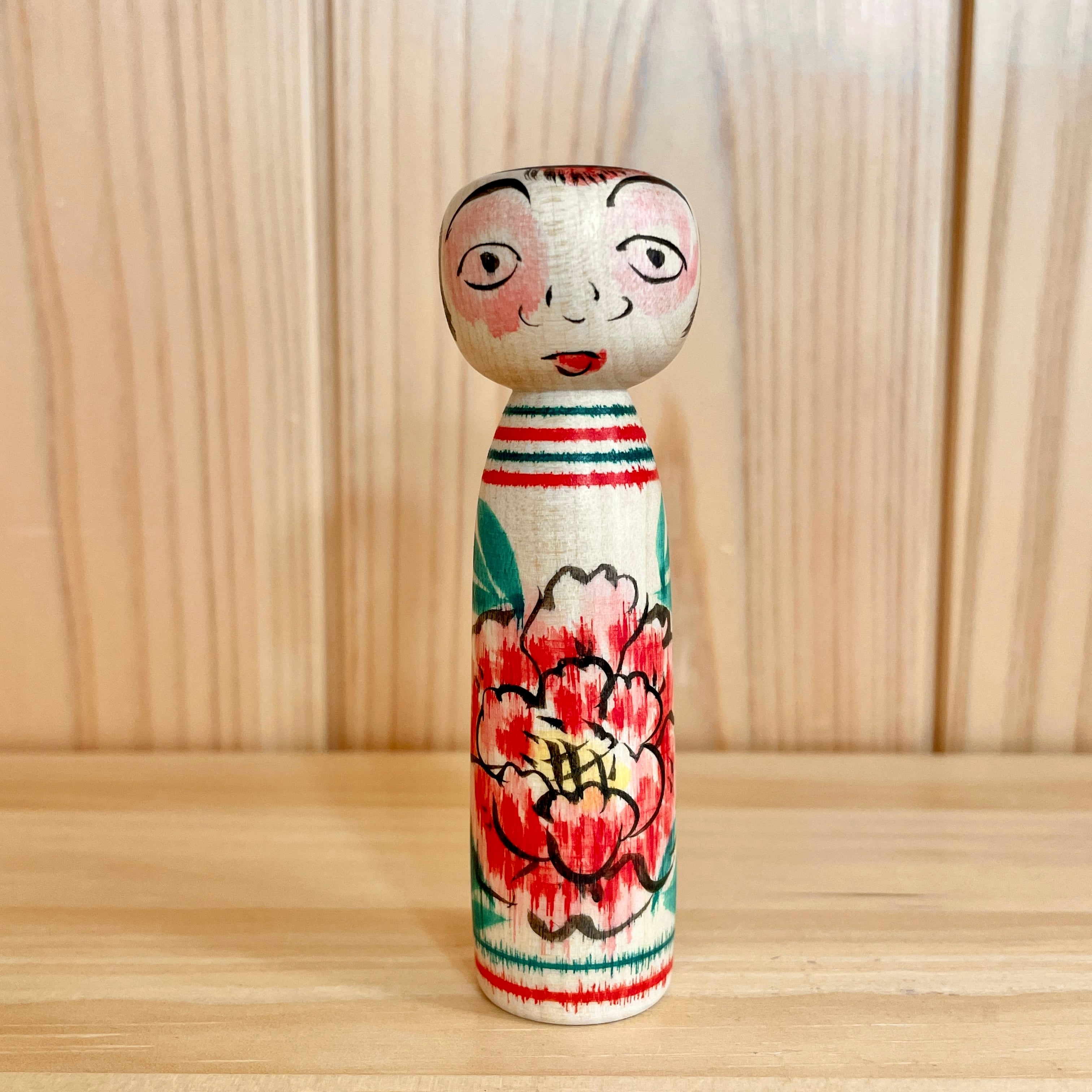 【柿崎文雄工人:中ノ沢系】3寸 こけし 牡丹 赤:約9㎝ N12FK-166