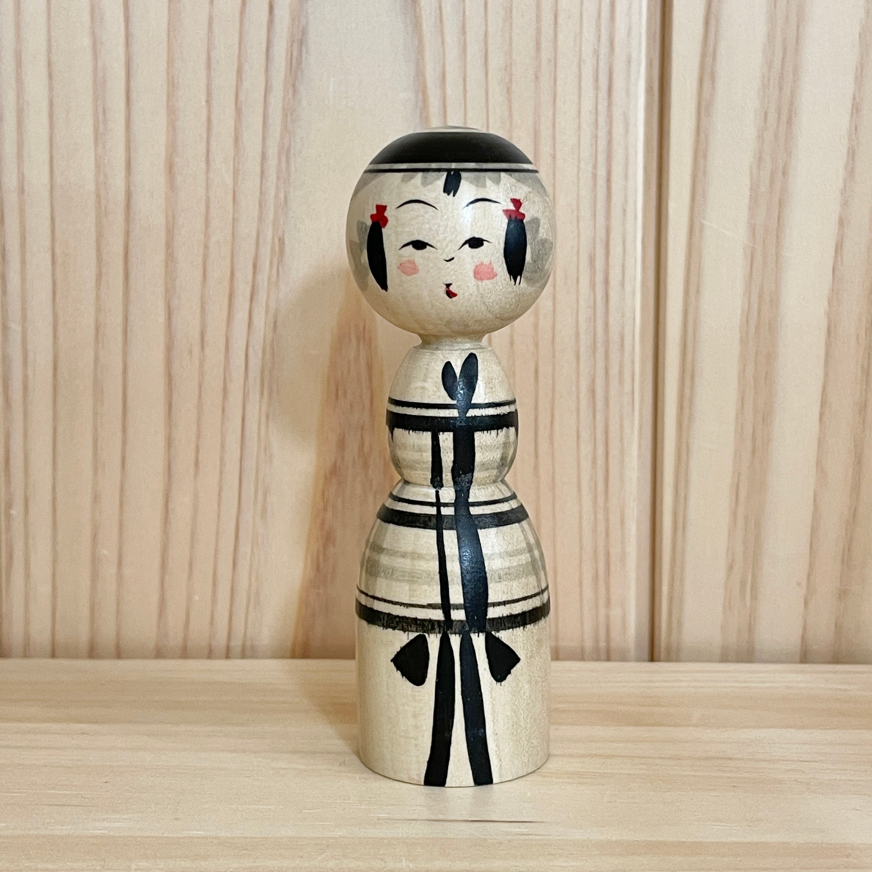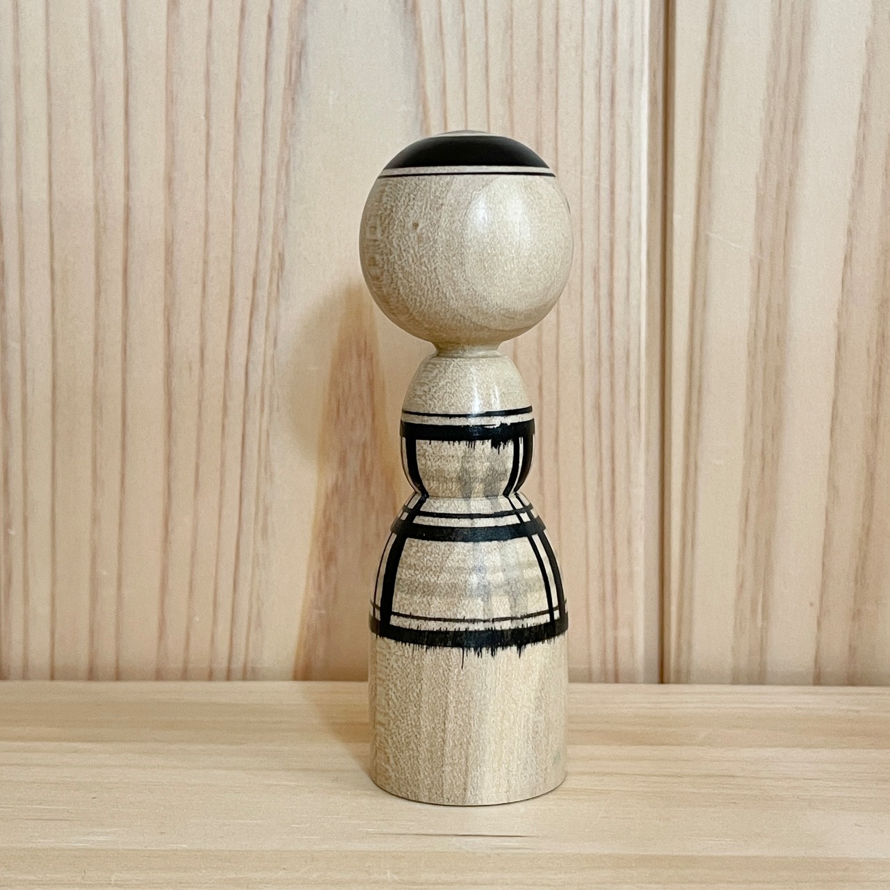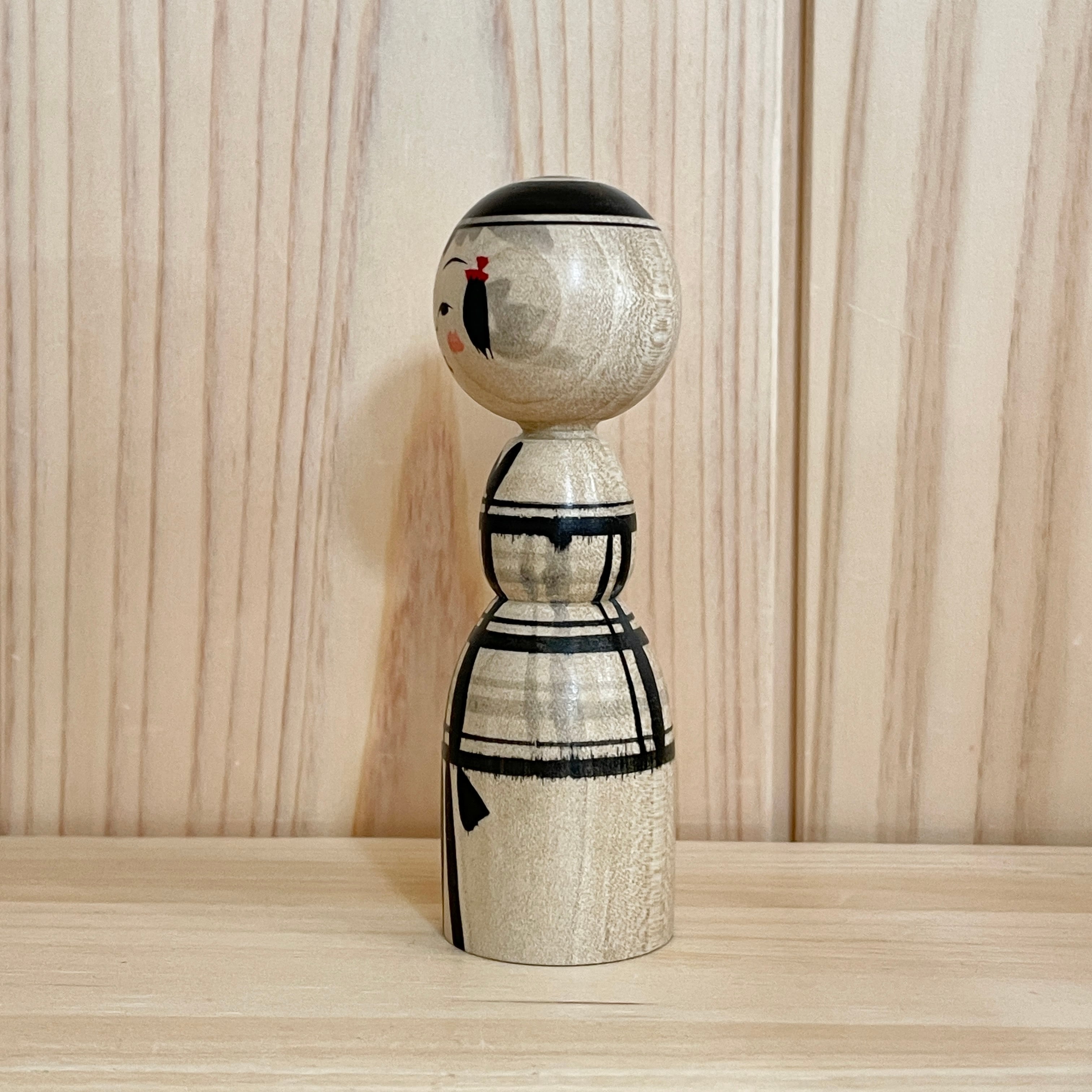 【池内潮音工人:弥治郎系】3寸 こけし くびれ 冬色チェック 黒・グレー:9cm N10SI-598