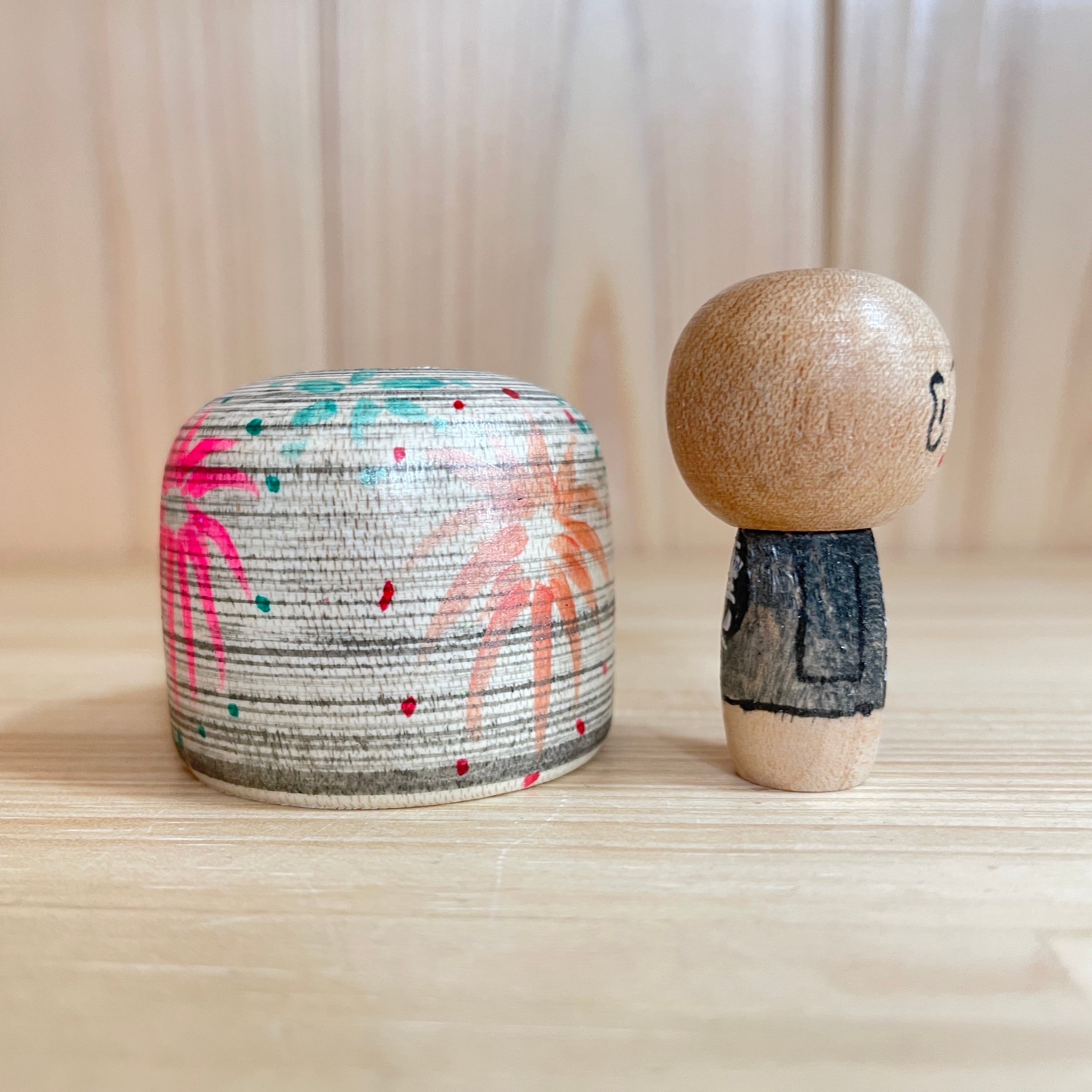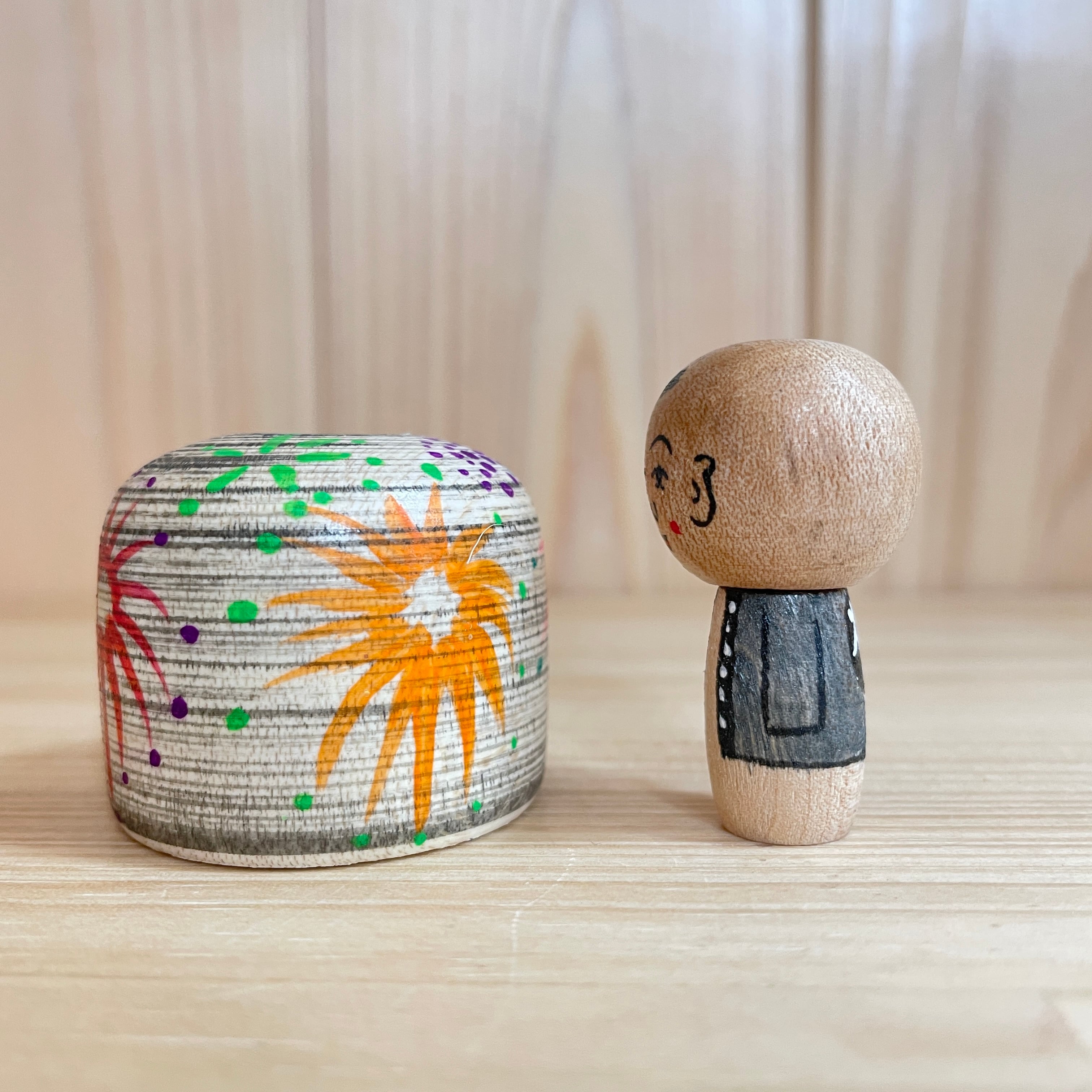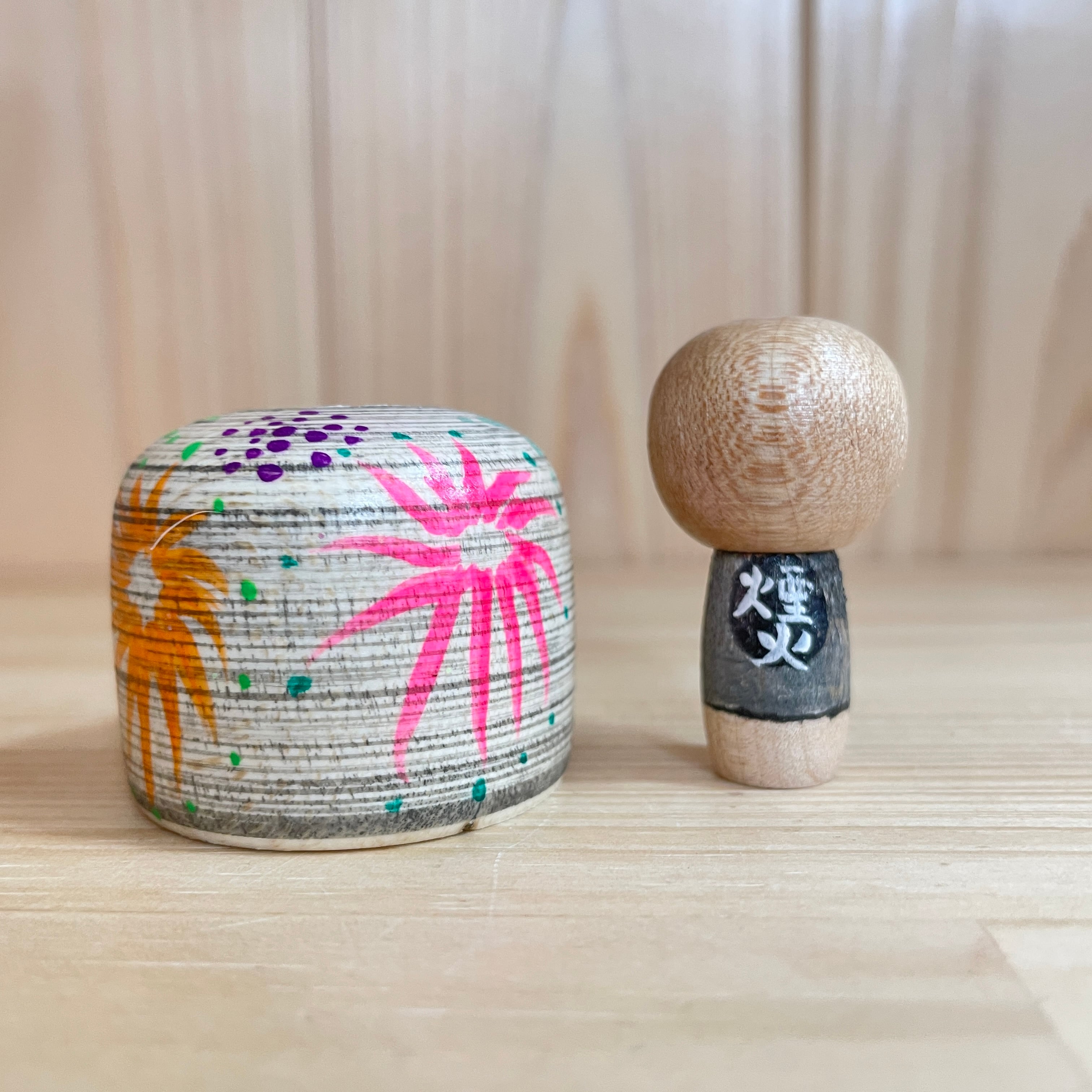 Since all kokeshi dolls are handmade by craftsmen, the grain and coloring of each kokeshi doll differs from one another.